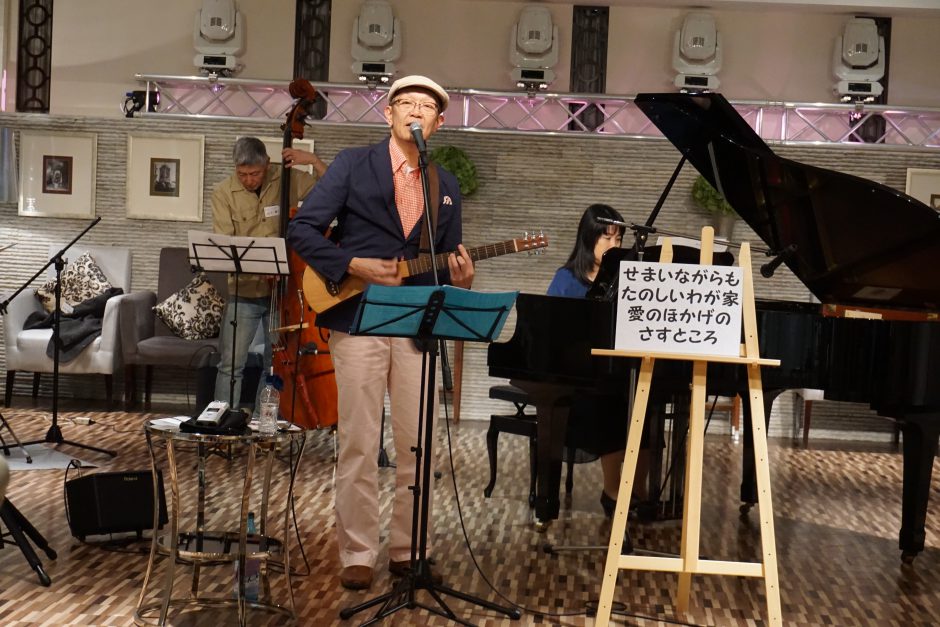 次に、昭和60年神学部院卒で前橋教会の牧師を務めている川上 盾氏と3名の有志によるジャズコンサートを行いました。若い頃はフォークソングを歌っていた川上氏は、50歳になってからジャズを始めたそうですが、天分とも言えるお話の上手さに加えて、年齢を感じさせない歌声とピアノ・ベース・ドラムの3名の抜群のテクニックに驚きながら、約1時間で全10曲を披露してくれ、全員大満足の様子でした。
